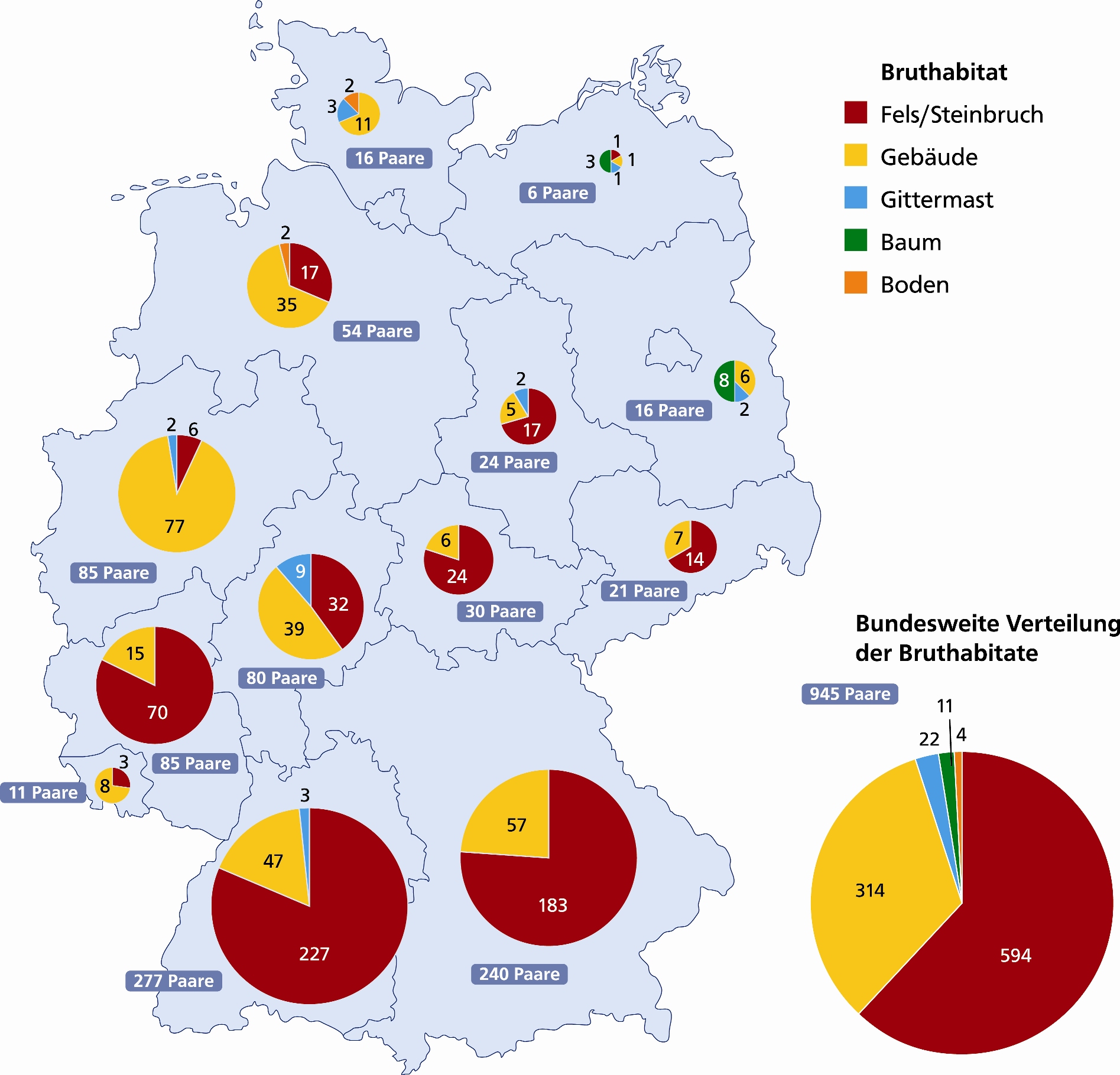 Die nachstehende Karte zeigt die Verteilung der Wanderfalken-Paare in Deutschland im Jahr 2006 nach Bundesländern und Bruthabitaten. Wie auf dem Kreisdiagramm rechts unten zu sehen ist, waren 2006 in der Bundesrepublik fast 950 Wanderfalken-Paare bekannt. Knapp ⅔ davon hielten sich an Felsen (Naturfelsen und Steinbrüche) auf und rd. ⅓ an Gebäuden. Weniger als 4% entfielen auf sonstige Habitate (Gittermasten, Bäume, Bodenbruten).